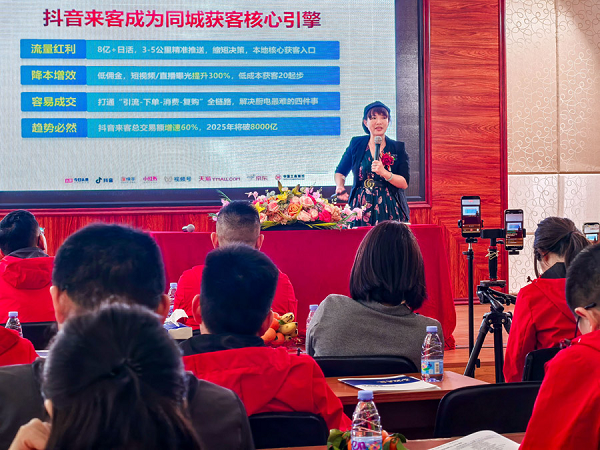 在发布会核心分享环节,广州创赢刘萍总经理率先登台,深度解读了为雅乐思量身打造的抖音来客全域运营矩阵。抖音来客作为同城获客的核心引擎,通过数据系统优化运营策略,可助力雅乐思实现从产品驱动到用户驱动的第二增长曲线。该体系以 “全链路共赢新增长引擎” 为核心,精准契合抖音生活服务“公域引流+本地承接”的生态优势,为门店获客提供全链路解决方案,是未来三年的主增长曲线。