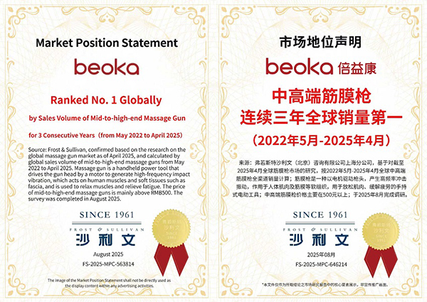 市场层面,倍益康已获全球知名机构沙利文认证“中高端筋膜枪连续三年全球销量第一”(2022年5月至2025年4月),产品远销70多个国家和地区。D2 Max作为倍益康专业医疗康复技术普惠的新载体,将专业的肌肉放松体验带给每一位用户。