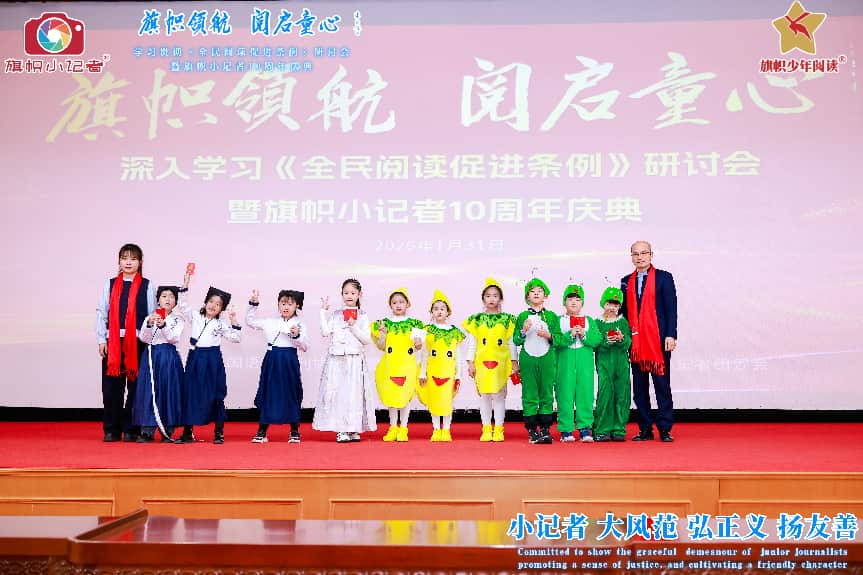 旗帜领航启新程,书香致远润童心。此次活动的成功举办,既是对过往十年育人成果的致敬,更是对全民阅读事业的郑重承诺。在《全民阅读促进条例》的指引下,旗帜小记者将继续以红色为底色、以阅读为路径,让更多青少年在书香浸润中成长为有理想、有本领、有担当的时代新人,为建设社会主义文化强国、实现中华民族伟大复兴的中国梦贡献少年力量。